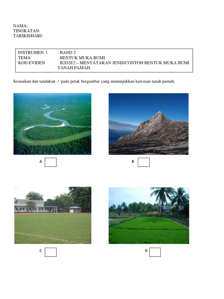 Bentuk muka bumi di malaysia (6.3 kepentingan pelbagai bmb di malaysia). Bentuk muka bumi di malaysia terdiri daripada tanah tinggi, tanah pamah, pinggir laut dan saliran. Kesan kegiatan terhadap alam sekitar. Bagian puncaknya adalah datar sehingga dapat digunakan untuk panggung pertunjukan. Daerah ini memiliki posisi lebih tinggi dari daerah lain, baik yang ada di dataran tinggi maupun dataran rendah.