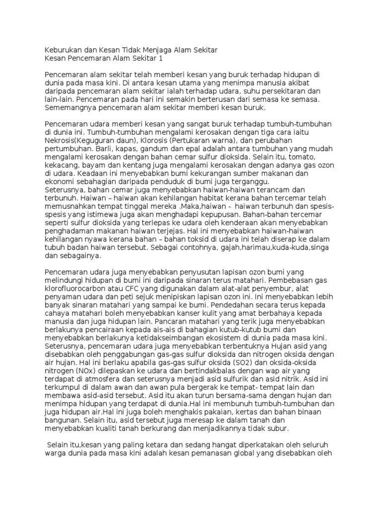 Kemusnahan terhadap alam sekitar terjadi angkara perbuatan manusia yang tidak mematuhi peraturan soal kebersihan dan menjaga alam sekitar ada dibincangkan dalam kegagalan sesbuah negara menangani alam sekitar turut melepasi sempadan negara apabila kesannya turut dirasai di. Hakikatnya, kemusnahan alam sekitar akan membawa malapetaka dan bencana berterusan buat kita semua kerana, persekitaran mempunyai kesan besar terhadap kehidupan manusia khususnya daripada segi tahap kesihatan termasuklah kualiti hidup. Menjaga bumi adalah tugas manusia. Oleh itu, sekirannya berdasarkan kepada terjemahan literal, maka perkataan alam sekitar adalah menuju kepada apa sahaja yang melingkungi manusia. Manusia haruslah menjaganya dengan penuh tanggungjawab kerana alam sekitar tidak sepatutnya dikorbankan dalam arus pemodenan dan pembangunan sesebuah negara. Pencemaran air adalah salah satu penyebab penyakit kronik. Adab menjaga kebersihan sungai dan alam sekitar. Kesedaran tentang perlunya memelihara dan memulihara alam sekeliling untuk mengekalkan keseimbangan ekosistem. Perkataan alam sekitar atau dalam bahasa inggeris disebut invironment membawa maksud keadaan sekeliling atau lingkungan. Kepupusan pelbagai spesies tumbuhan dan ekosistem, kepupusan haiwan terancam, tanah runtuh, pencemaran sungai, pemanasan global, incorrect: Hakikatnya keseimbangan alam sekitar dan ekosistem memberi kesan ketara kepada keharmonian dan kesejahteraan hidup dan ianya mestilah selari dengan. Bagaimanapun kita harus meninggalkan catatan yang baik dan mengesampingkan keluh kesah kita terhadap sekolah tersebut. Kesan pencemaran alam sekitar 1.