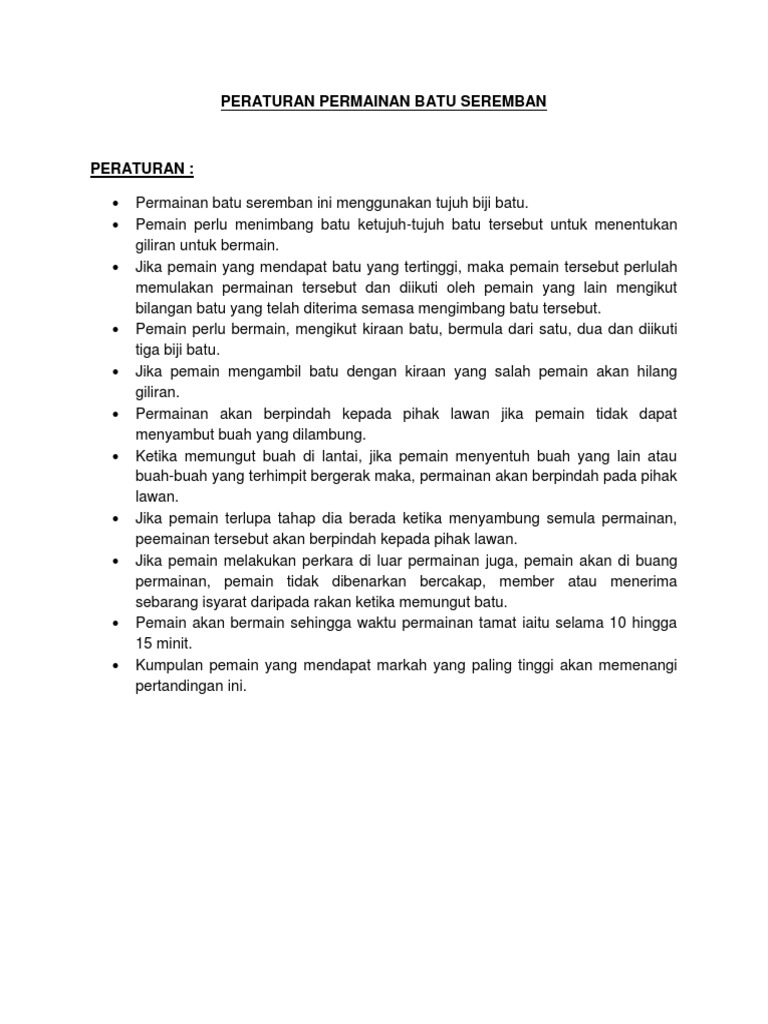 See more of permainan batu seremban on facebook. Permainan ini akan bermula dengan peringkat pertama yang mudah, di mana sebiji buah yang. 2.0 sejarah permainan permainan batu seremban atau juga dikenali sebagai batu selambut atau serembat ialah sejenis permainan tradisional yang dimainkan di malaysia. Walaupun permainan batu seremban ini merupakan permainan tradisional yang hanya memerlukan kita duduk sahaja untuk bermain, ianya memerlukan fokus yang sangat tinggi. How to play batu seremban. Batu seremban, or 5 stones, is a traditional game suited for players of all ages. Batu seremban juga dikenali sebagai permainan selambut atau serembat. Ia biasanya dimain secara berkumpulan. Ia juga dikenali sebagai selambut ataupun serembat. Seperti permainan yang lain, batu seremban juga ada peringkatnya yang digelar sebagai buah. Ia sering dimainkan pada waktu lapang. This is permainan batu seremban by hanif razak on vimeo, the home for high quality videos and the people who love them. Sering dimainkan di waktu lapang.